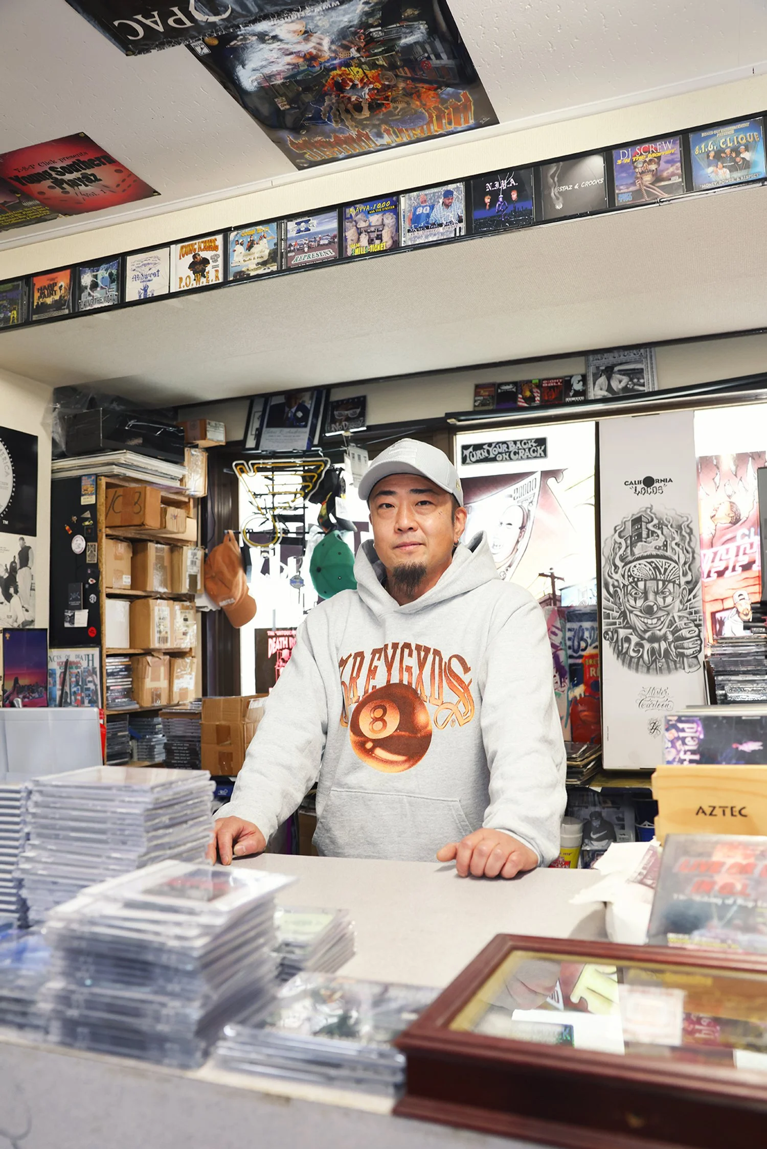 アメリカ各地のローカルに根付いたギャングスタラップやG-ファンクを扱うショップ「IITIGHT MUSIC(ツー タイト ミュージック)」。店の扉を開けた瞬間、ぎっしりと並べられたレアなテープやCD、レコードの圧倒的な量に息をのむ。これまでに扱った枚数は70万枚以上と聞いて、店主の気合いが伝わってくる。この店を切り盛りするのは、横浜生まれのShu。ヒップホップとの出会いは中学2年生の時だった。地元の公民館で先輩が聴いていたN.W.Aやパブリック・エナミーに衝撃を受け、その後ブレイクダンスにのめり込む。バトルでは優勝を重ね、「いつかアメリカに行く」と心に決める。