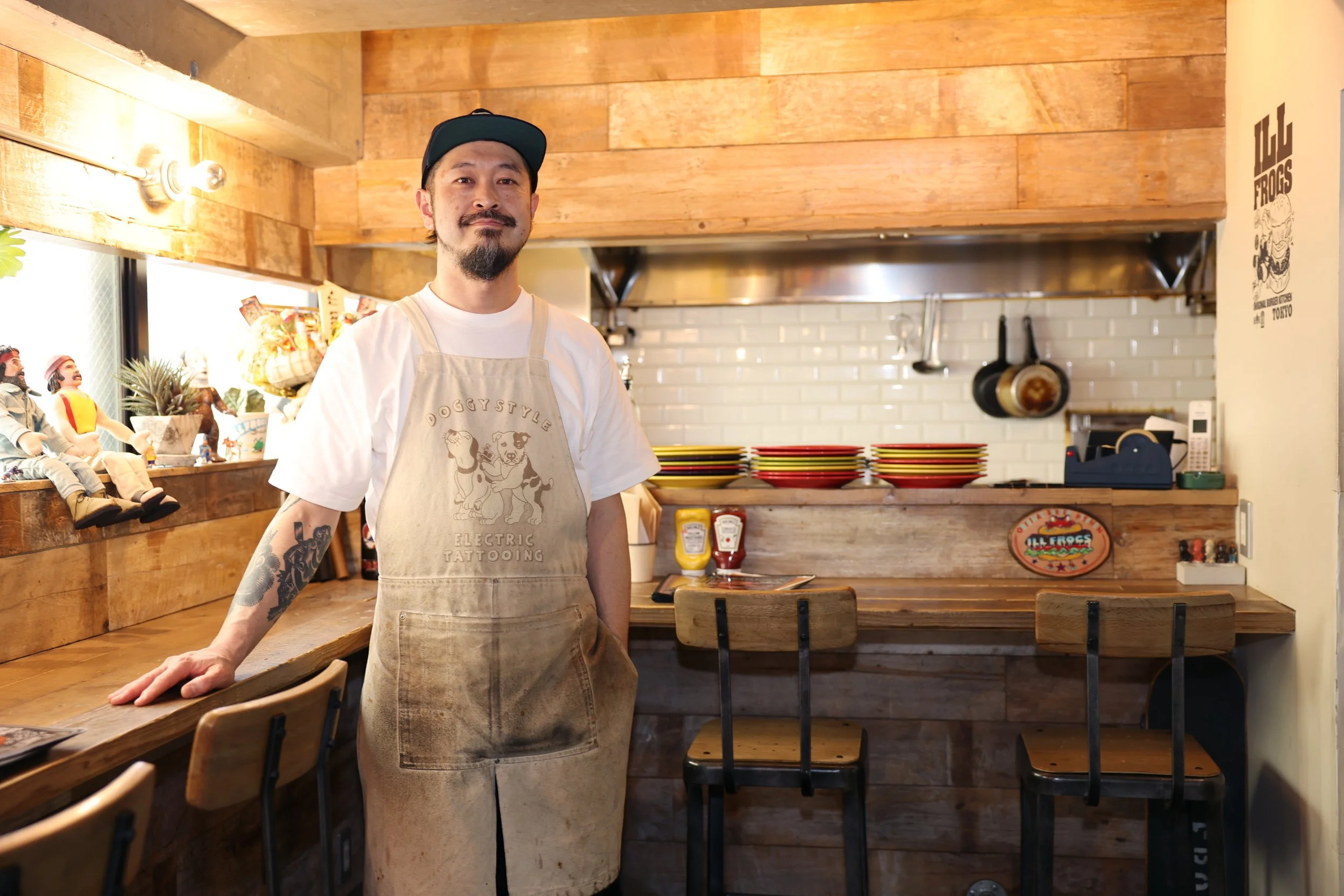 中学の頃はバスケ一筋だったと言うオーナーのSHIN1RAW、大好きなNBA のVHSでヒップホップを知り、衝撃を受けて以来虜になった。高校を卒業後は建築会社に勤め、鳶職を経験したのちに、地元調布にあるダイニングバーで働き出す。飲食業は自分に向いていてとても楽しいと感じていたが、一旦トラックの運転手に転向。2年ほど務め、1人でとことん集中した貴重な時間を経て、その後また飲食業に復活した。いろんな店で修行を積み、4年前にグルメバーガー屋「ILL FROGS」をオープン。店のコンセプトや店名の由来、月替りで出しているバーガーの思い出についてなどを聞いた。