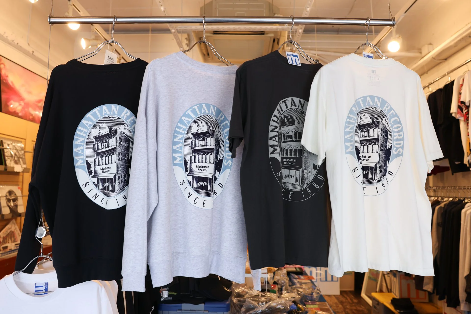 新品レコードと自社オリジナルグッズをメインに、中古レコードやカセットテープも広く取り扱っていますが、今の一番人気は、“m”ロゴを使用したグッズやアパレルでしょうかね。アパレルについて説明すると、昔は「Manhattan Clothes & Shoes」というセレクトショップが今の店の隣にあって、オリジナルアパレルと他ブランドの服や靴を扱っていたんです。その店が2010年になくなって以降、アパレルはレコードのおまけみたいな感じで続けていたんですけど、時とともにロゴグッズに対する人気というか、お客さんの認知度を感じるようになったんで、コロナ前後ぐらいからしっかり展開していこうとなりました。若い子たちも手に取ってくれるようなアイコニックなアイテムを、うちのスタッフのKaleido(Sound’s Deli)にデザインしてもらっています。今は、リニューアル後の店舗が背面に描かれたTシャツやスウェットが人気です。