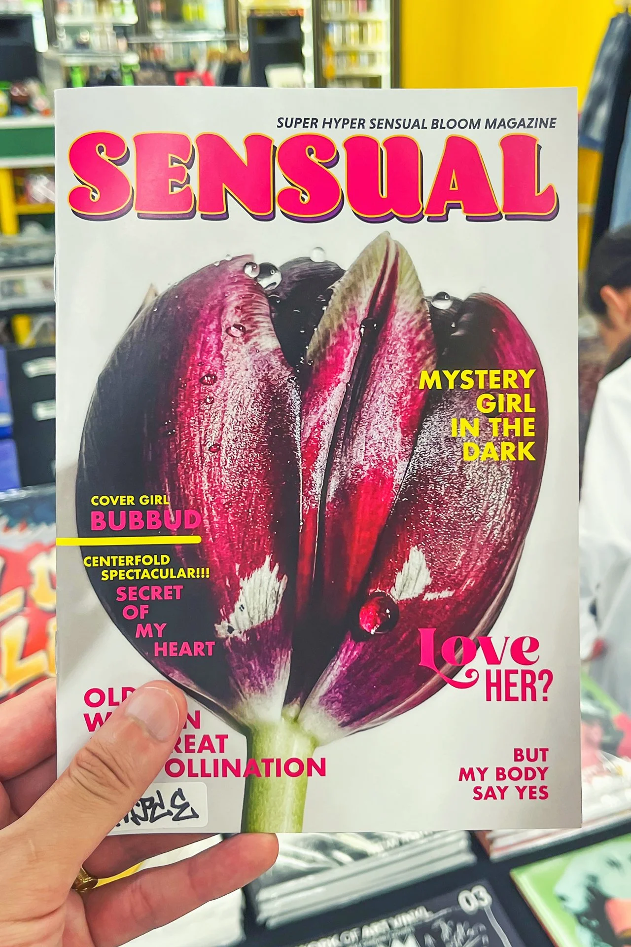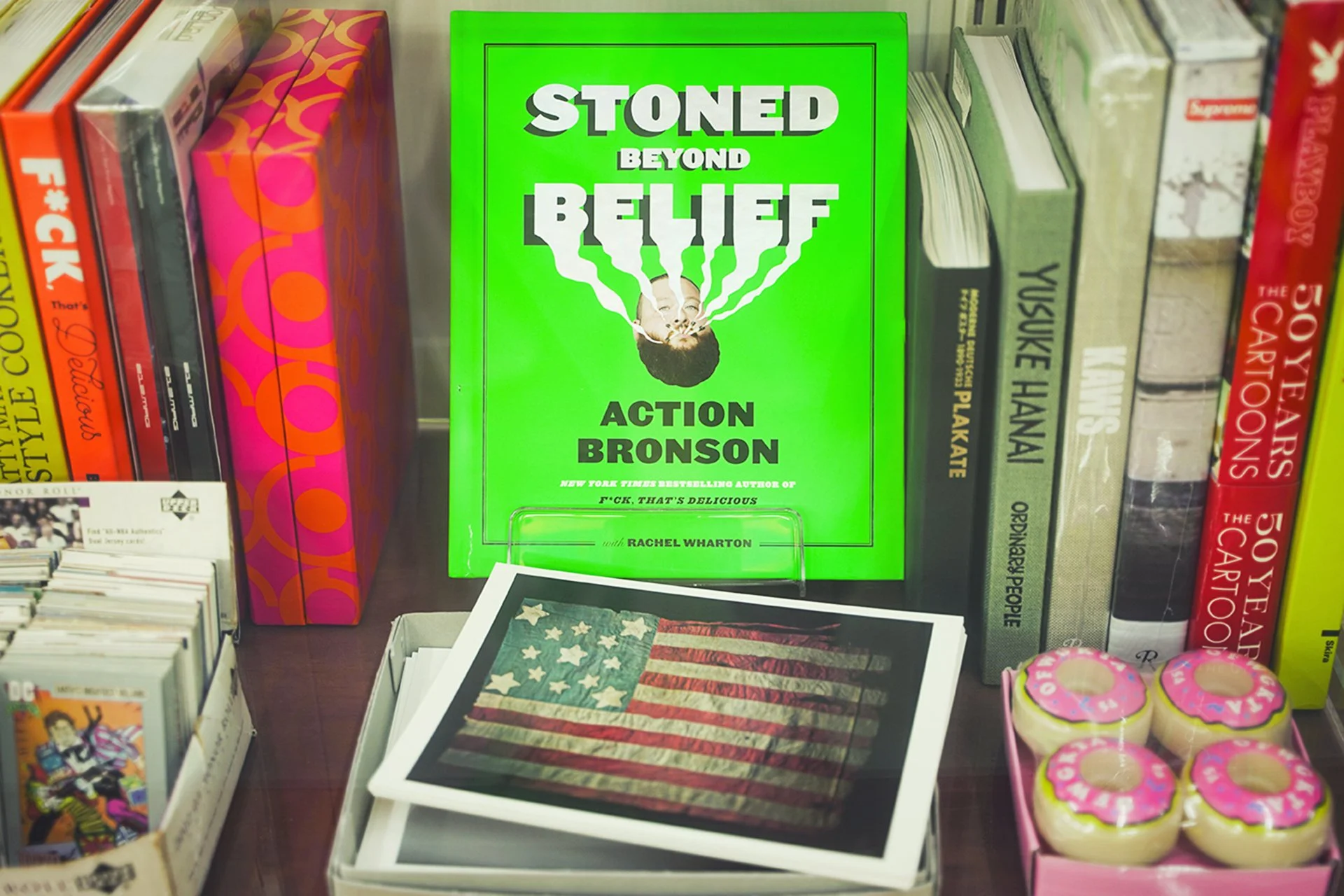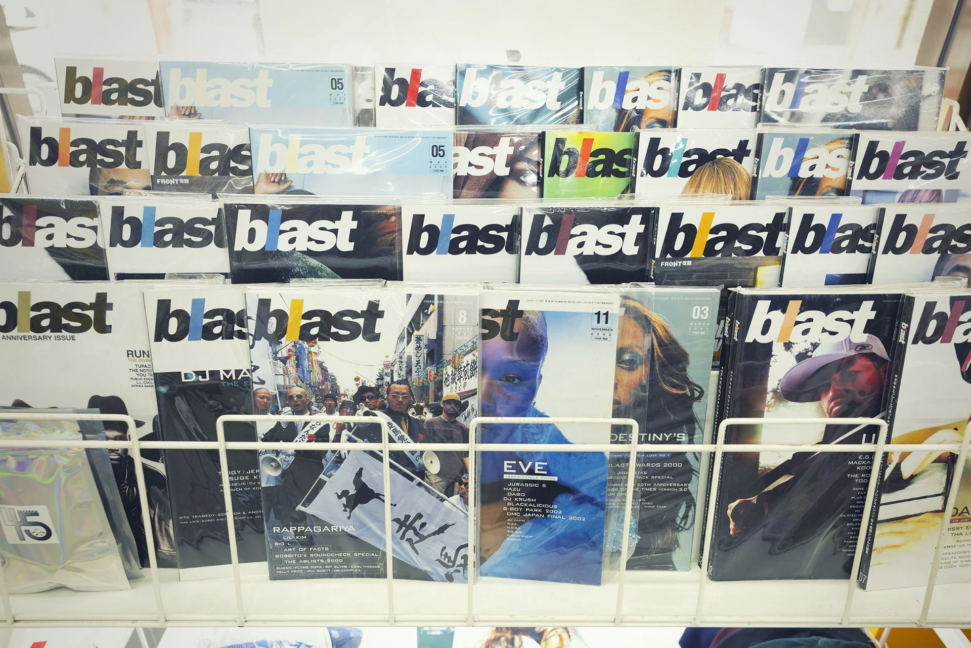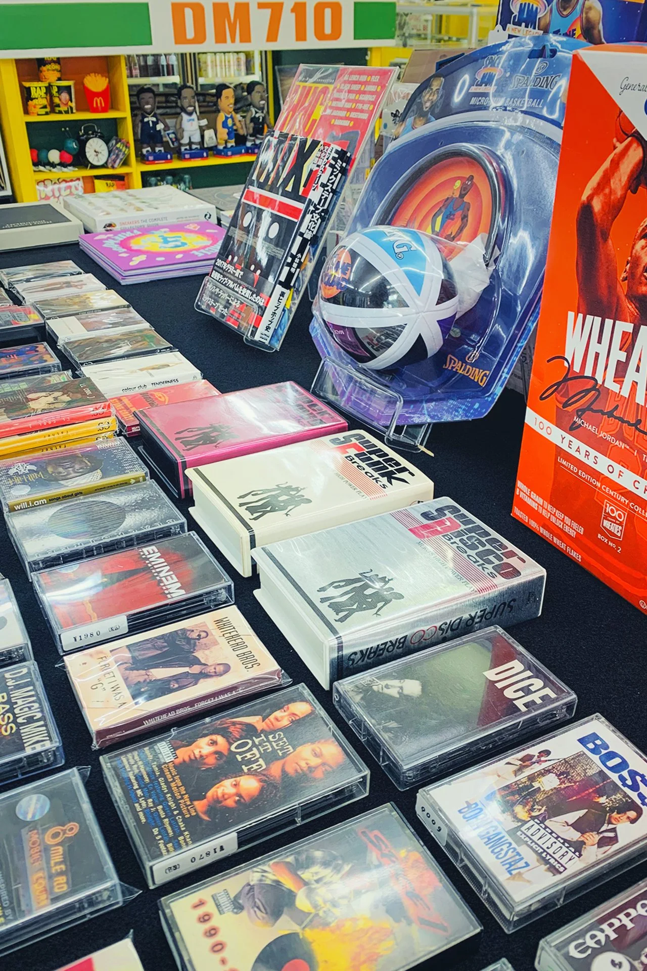 充実したお酒とタバコ、そして個展やポップアップを行った際のアーカイブ商品や作品。あと、「blast」「FRONT」「WOOFIN’」「LUIRE」などのヒップホップマガジンや「Juxtapoz」等のアート系マガジンのアーカイブです。加えてDM710のメンバー達の本やレコードのコレクションを大放出しています。ちなみにこの「JET」のアーカイブはメンバーがアメリカのコレクターから鞄ごと買ってきたものです。なかなか売ってくれなくて、「俺はこのJETを並べて壁紙にするのが夢なんだ!」等の想いを聞かされ、その想いごと無理くり購入してきたので、私たちは責任を持ってその夢を叶えなきゃなと思っています。