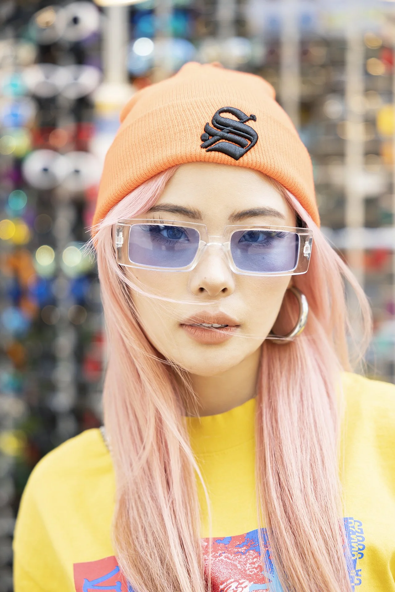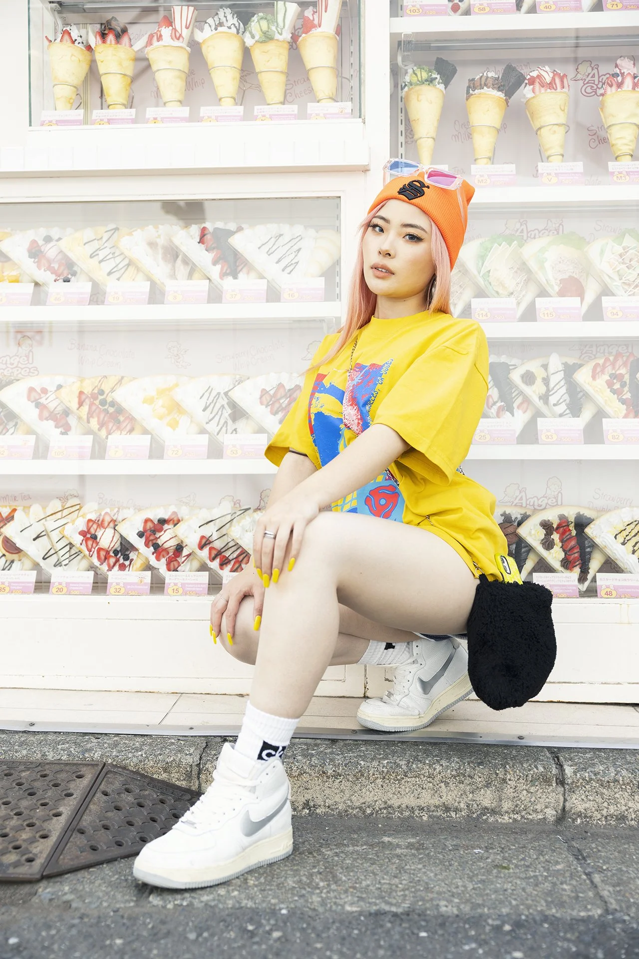 A STADIUM beanie and a Virgil Normal T-shirt. I made it look like summer with this vivid yellow and orange.