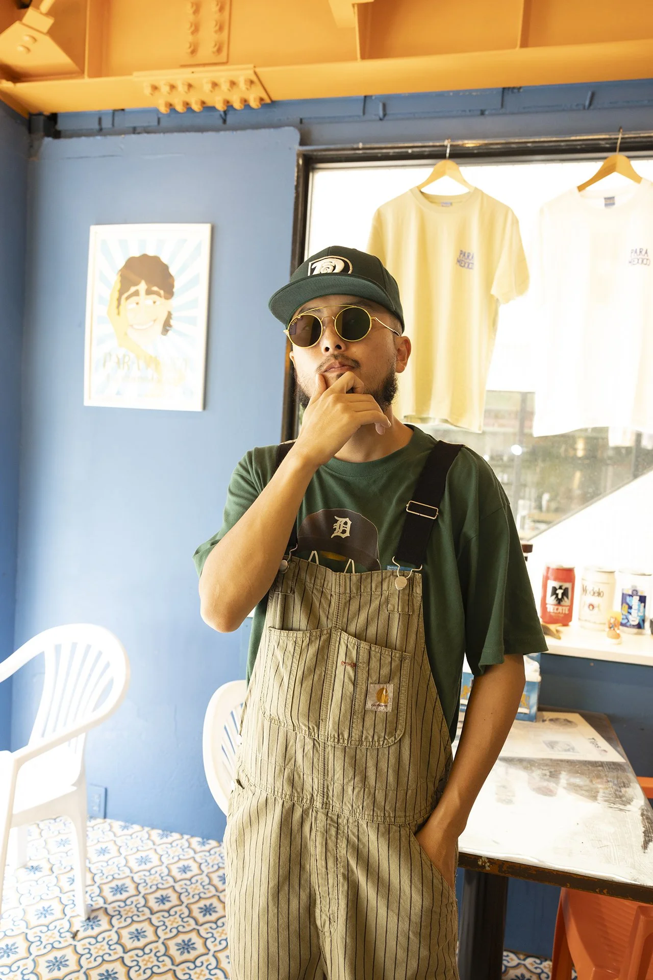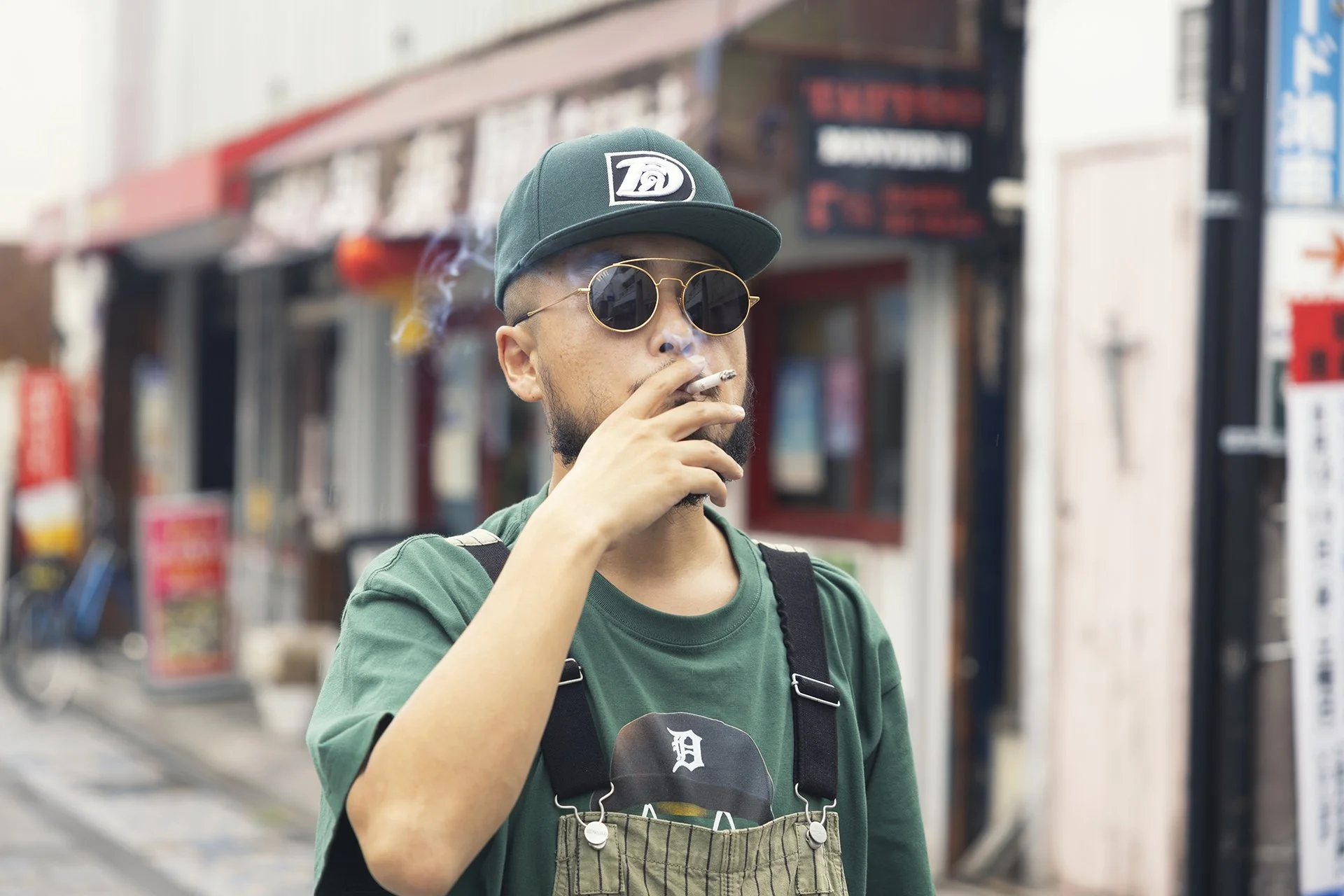 緑と “D”って感じですね。カーハートのオーバーオールとアシックスの靴はもらったもので、Tシャツはアルバムリリースの時にマンハッタンレコードの限定で作ってもらいました。キャップは、D。とにかくDしか被りたくない。Dはデトロイトとドジャースくらいしかないんで、自分で作って。あと、色で言うと最近緑ばっかです。その日の自分の色があるって感じすけど、今は緑。