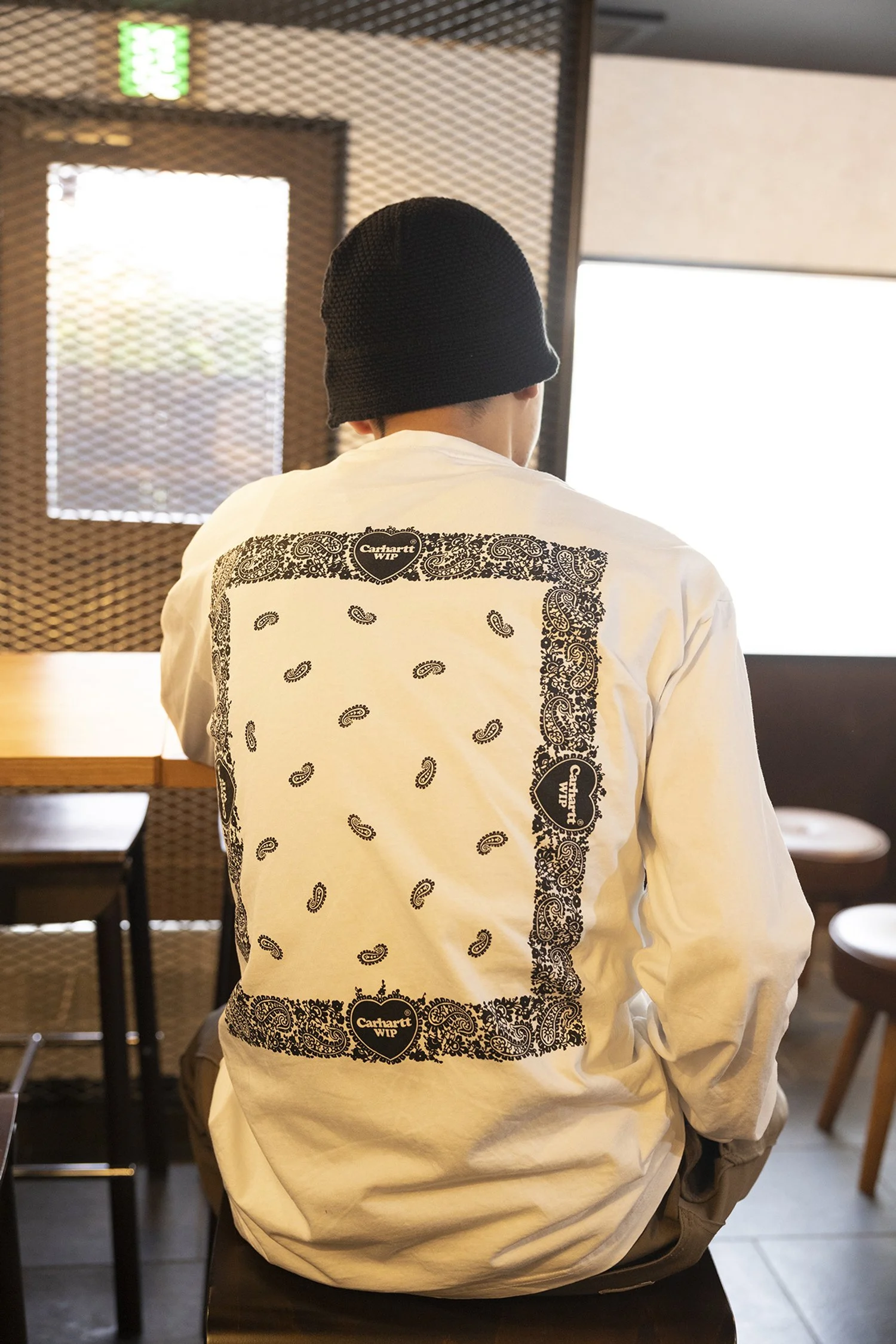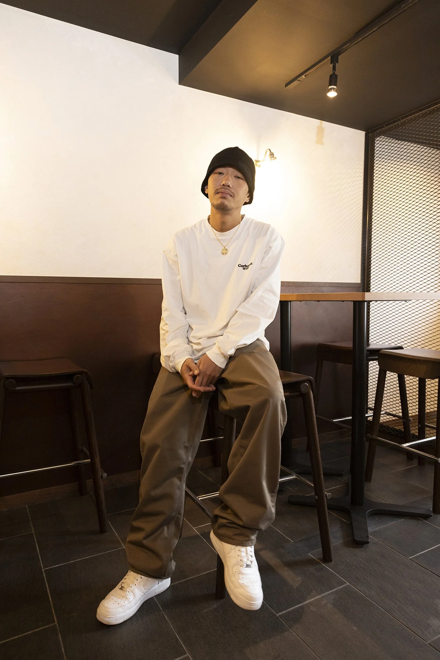 カーハート(Carhartt)のロンTと、スニーカーはいつものエアフォース1で、帽子は千葉の柏の方でお世話になってる先輩のブランド、スーパートランプ(SUPTERTRAMP)のものです。基本シンプルな感じが多いですね。昔スケートやってた頃、無地Tにリーバイスの太いジーパン履いてみたいなシンプルな格好が多かったんで、そこから来てるかも。サイズは気分に合わせて落としたりするけど、大体太めが多いです。