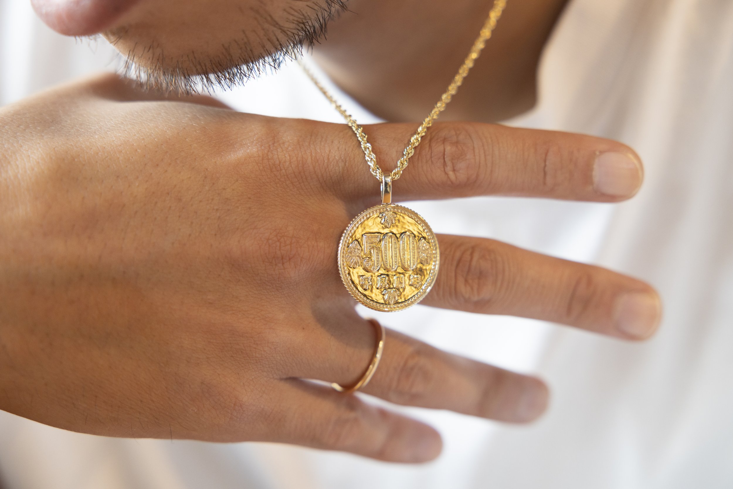 KANDYTOWN(キャンディタウン)のメンバーのDONY JOINT(ドニー・ジョイント)が「GOOD ¥ELLA(グッドイェラ)」ってブランドをやってて、そこで作ってもらったやつです。自分の生まれ年の平成4年で、一番高い硬貨の500円玉で。