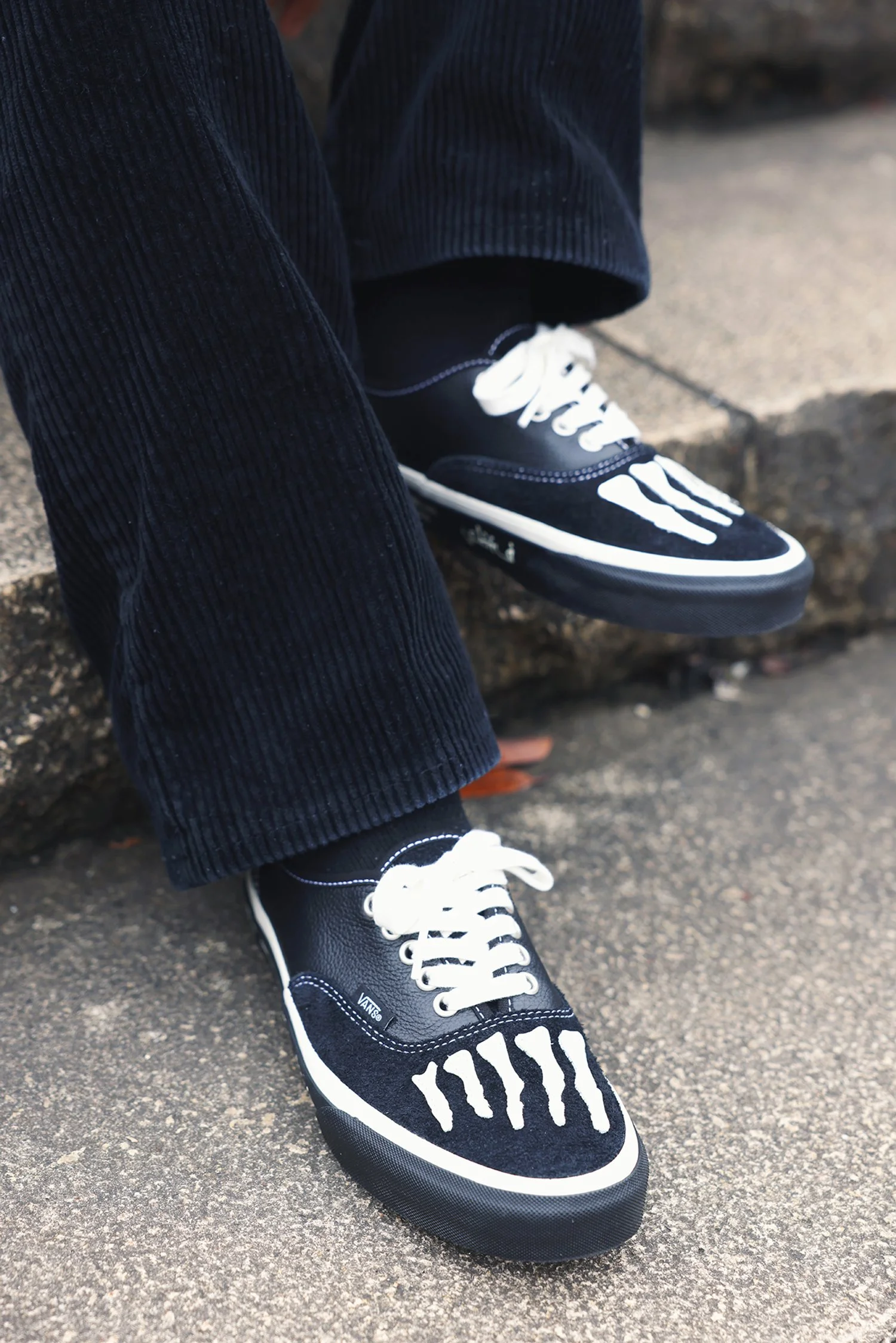 スニーカーが好きで、スニーカーを中心にコーディネートを組むことが多いんですけど、今日は黒のスニーカーなんで、パンツは黒で、グレーとか白の差し色を入れて、スニーカーが目立つようにしました。バンズとサボタージュっていうシンガポール発のブランドのコラボモデルで、レザーとスエードが組み合わさってて、骨のディテールがかわいいなと思ってます。